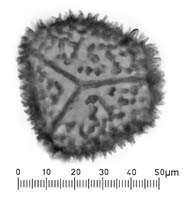 1b Spores smoothly foveolate on proximal face; distal spines stout at base, sometimes appearing forked in side view. Usually in urban areas; probably exotic.