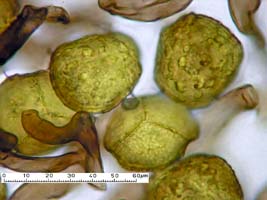 1b Spores yellow, finely echinate distally (except bumpy in P. hallii ); chloroplast shape usually ovoid to angular, not constricted in middle; thallus with tubers lacking or older thallus with tuberous thickenings on margins.