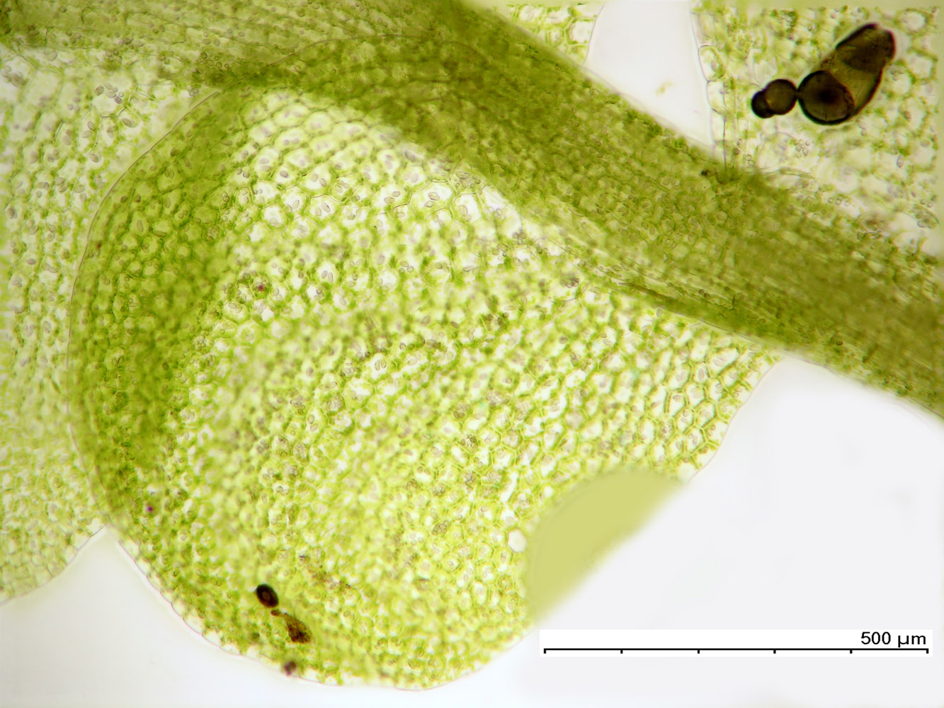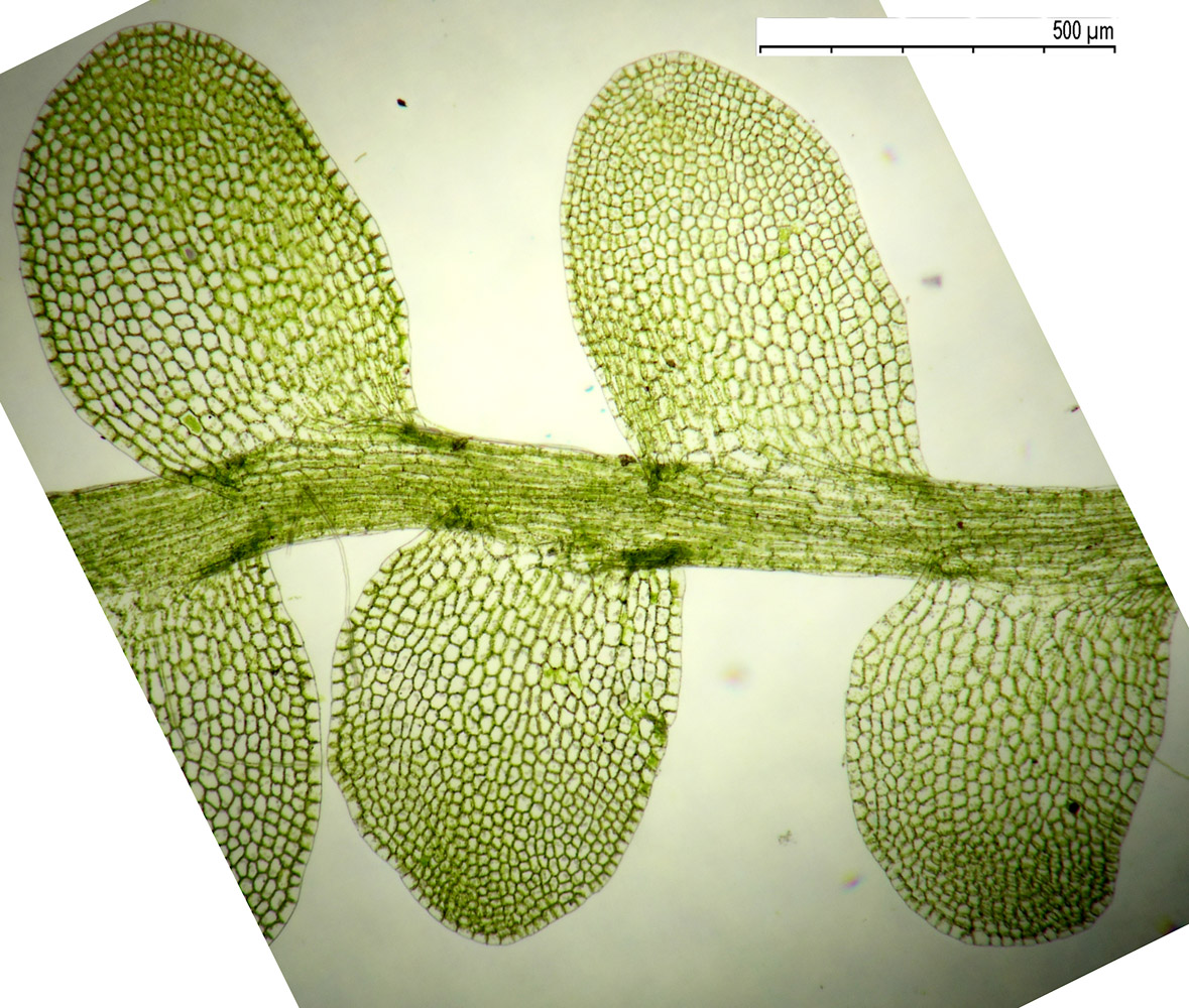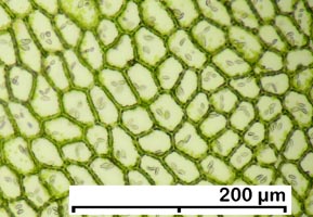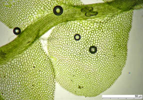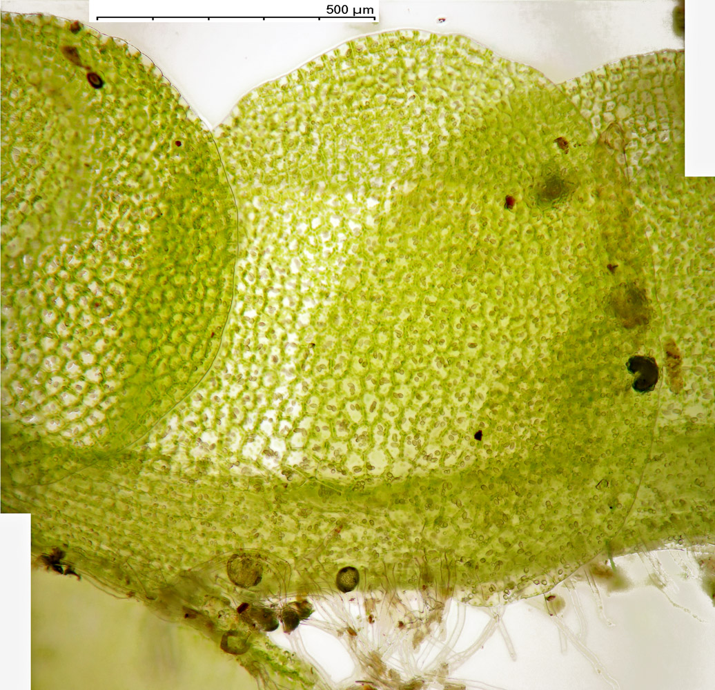 Jungermannia hyalina -- Cells of leaf margin showing oil bodies. Fawn Lake, Klamath County, Oregon, DHW m2416.