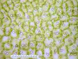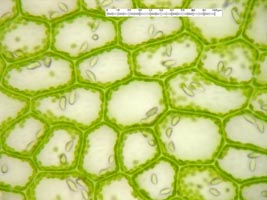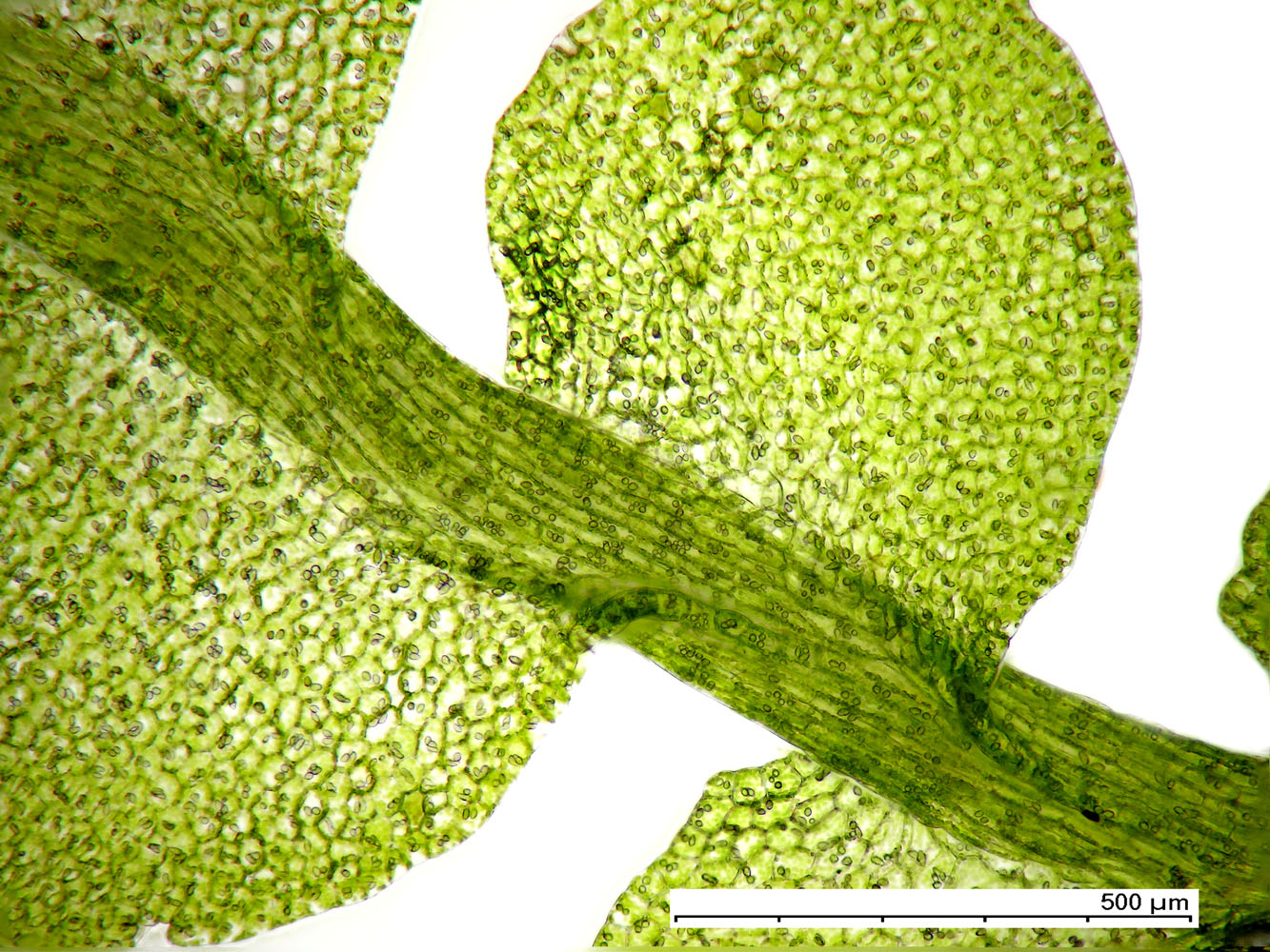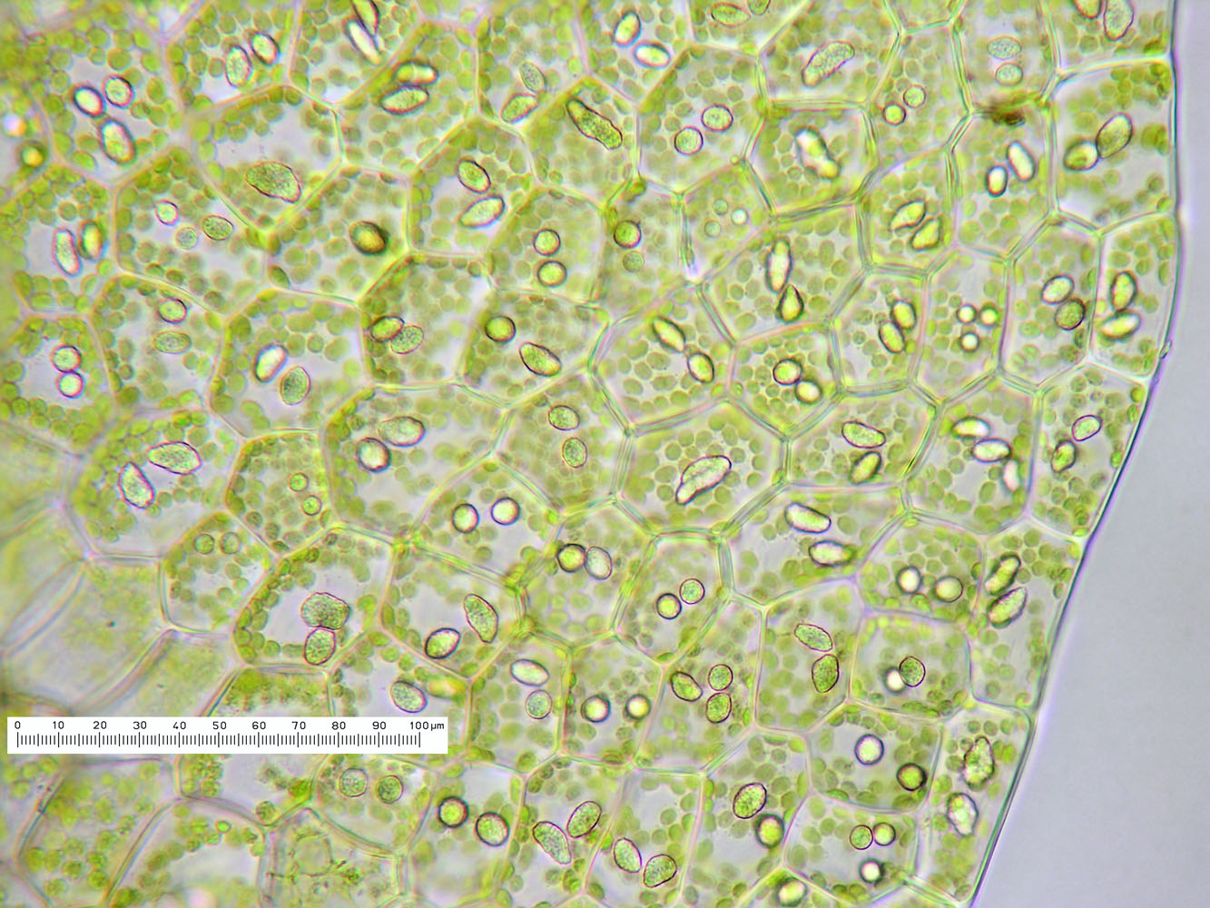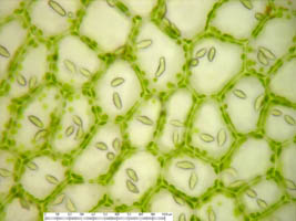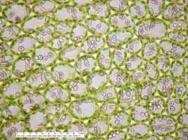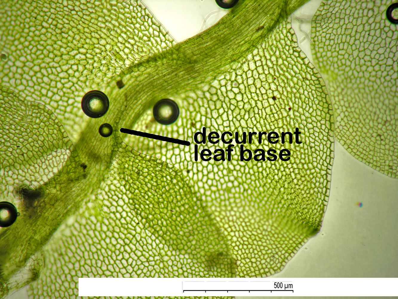 Jungermannia hyalina -- Cells of leaf margin showing oil bodies. Fawn Lake, Klamath County, Oregon, DHW m2416.