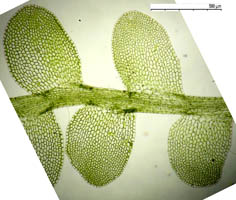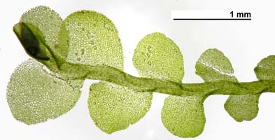 Jungermannia hyalina -- Shoot, dorsal aspect showing leaf insertion. Opal Creek, Marion County, Oregon, DHW m2131.