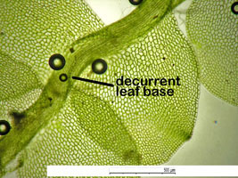 Jungermannia hyalina -- Shoot, dorsal aspect leaf base decurrency. Opal Creek, Marion County, Oregon, DHW m2131.
