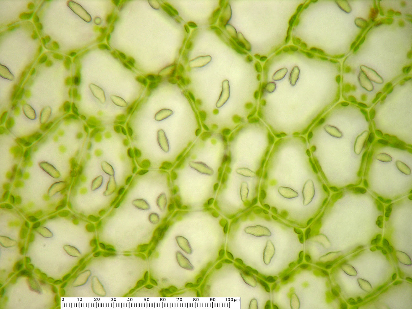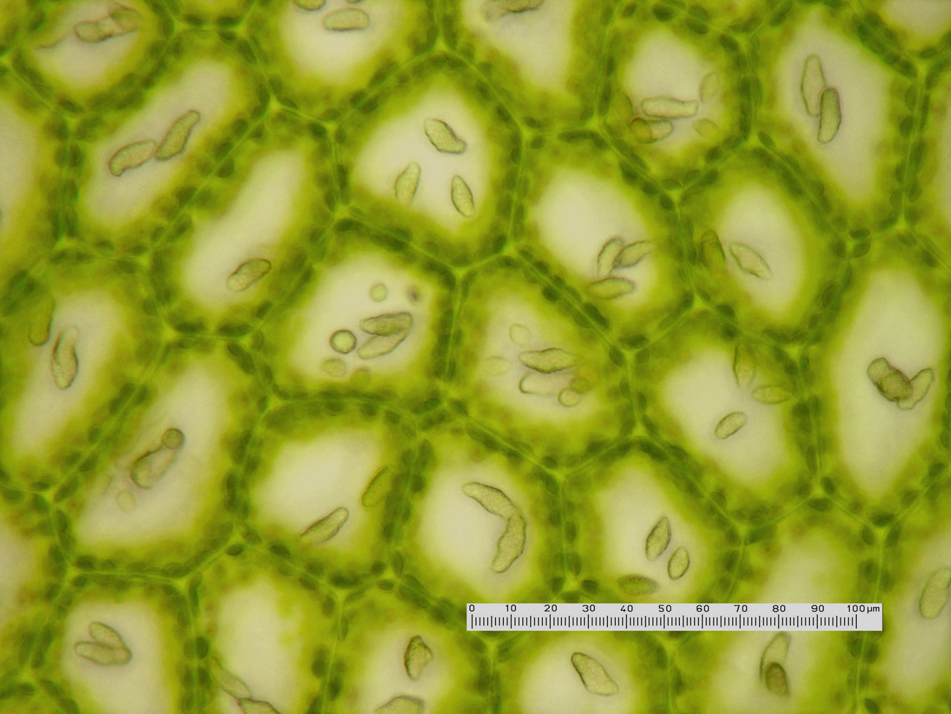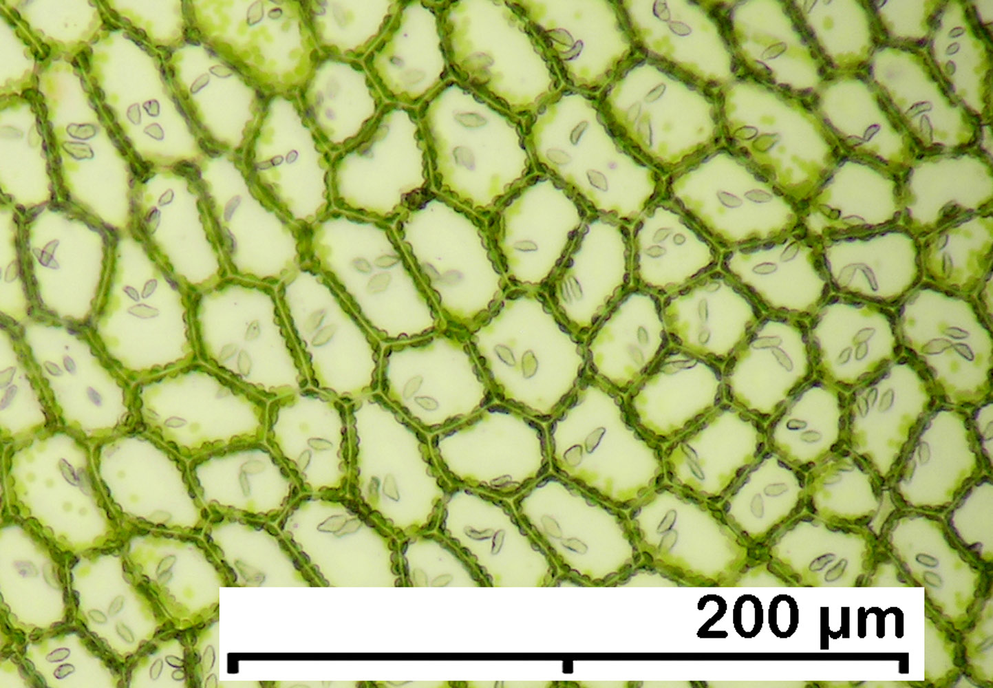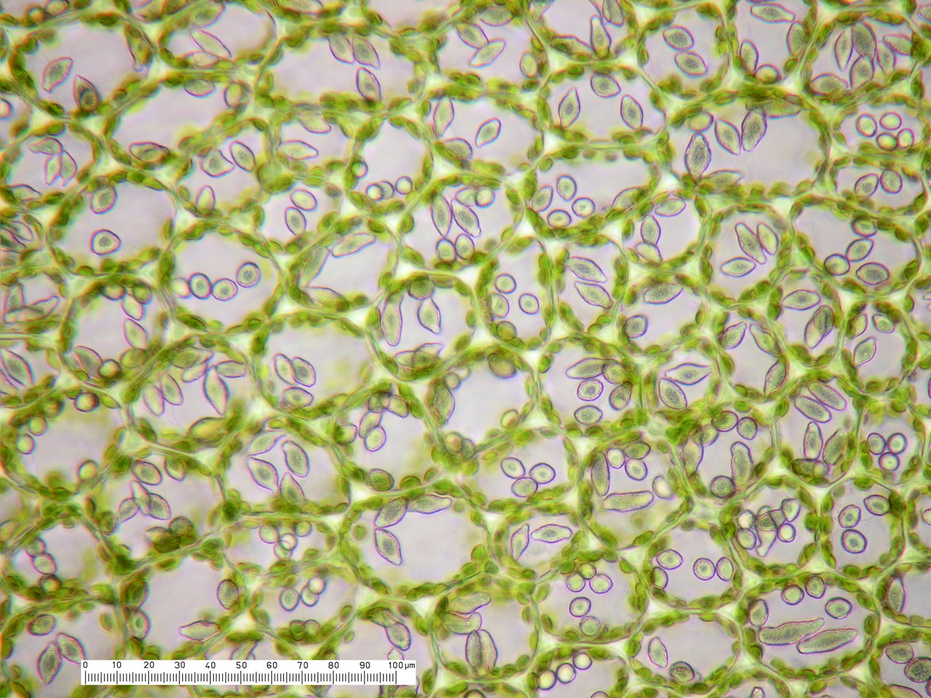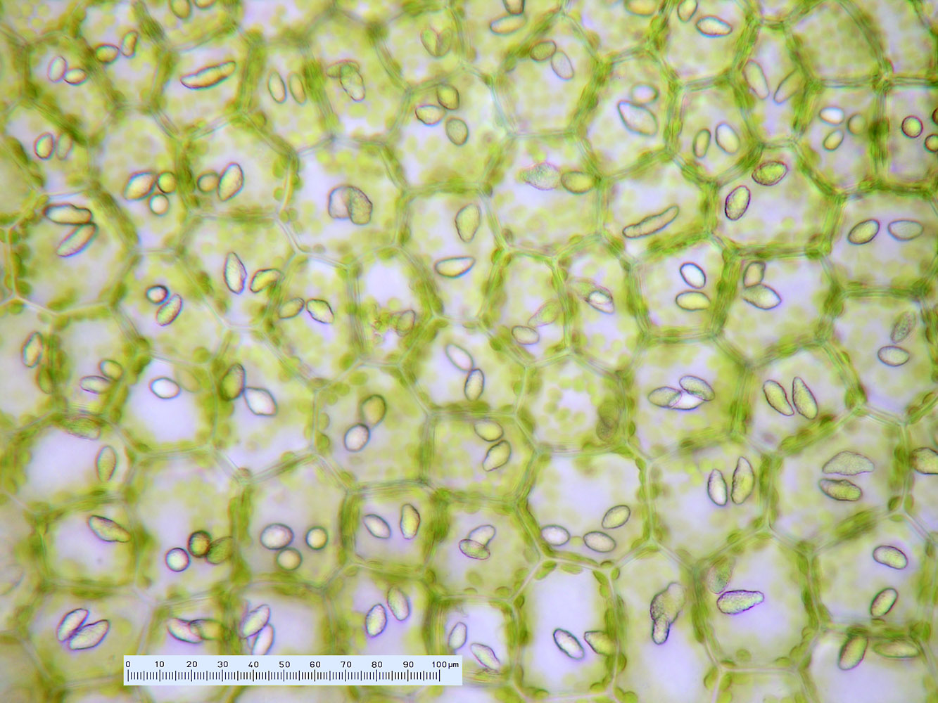 Jungermannia hyalina -- Median leaf cells showing oil bodies. Opal Creek, Marion County, Oregon, DHW m2131.