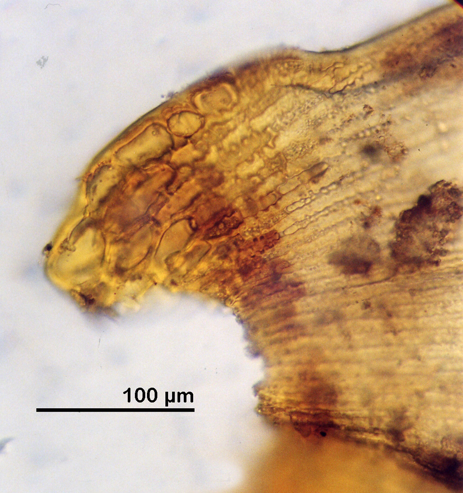 8b Alar cells weakly differentiated, restricted to basal margins, thin walled, rarely auriculate; inflated only in R. aciculare; leaf cells in section are thickened over the vertical walls and thinner or grooved over the lumens except in R. ryszardii.
